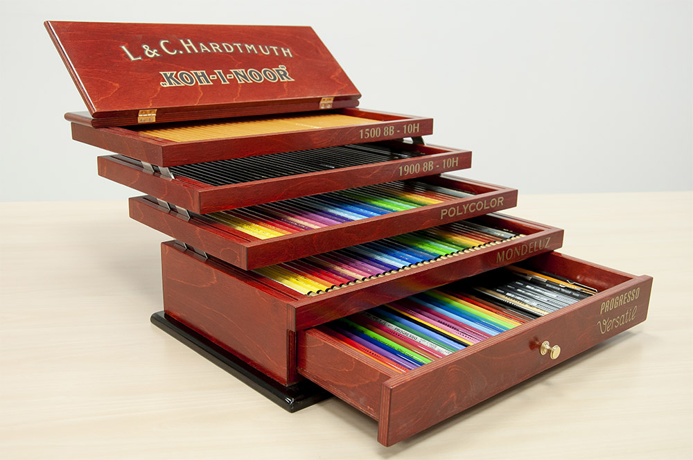 Produktem, który wieńczy całą dzisiejszą notatkę jest piękny zestaw z szufladkami. To ogromny zestaw, który zawiera w sobie kilka mniejszych zestawów kredek i ołówków. Znajdziemy w nim podstawowe nazwy takie jak Mondeluz, Polycolor, czy Progresso oraz ołówki 1500 i 1900. Każda seria posiada swoją szufladkę. Czyż nie jest wspaniały?
