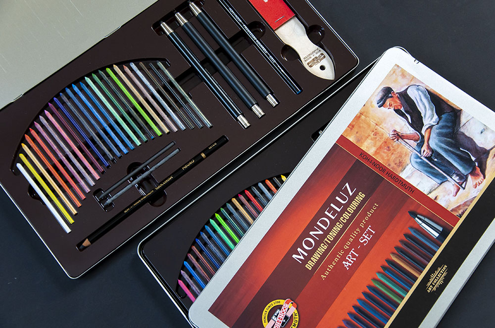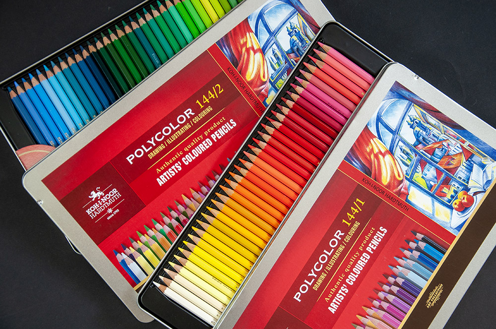 Jesteśmy także ciekawi, czy kiedyś próbowaliście już zestawów Polycolor i Mondeluz w postaci grafitów? Jeśli nie, to mamy właśnie takie zestawy, które liczą 24 kolory, a dodatkowo zawierają ołówki mechaniczne oraz ostrzałkę. Zestawy te świetnie sprawdzą się u artystów, którzy lubią pracować na większych formatach, ale ze względu na swoje niewielkie gabaryty i średnicę 3,8 mm pomogą również szybko zakryć duże powierzchnie na formatach małych.