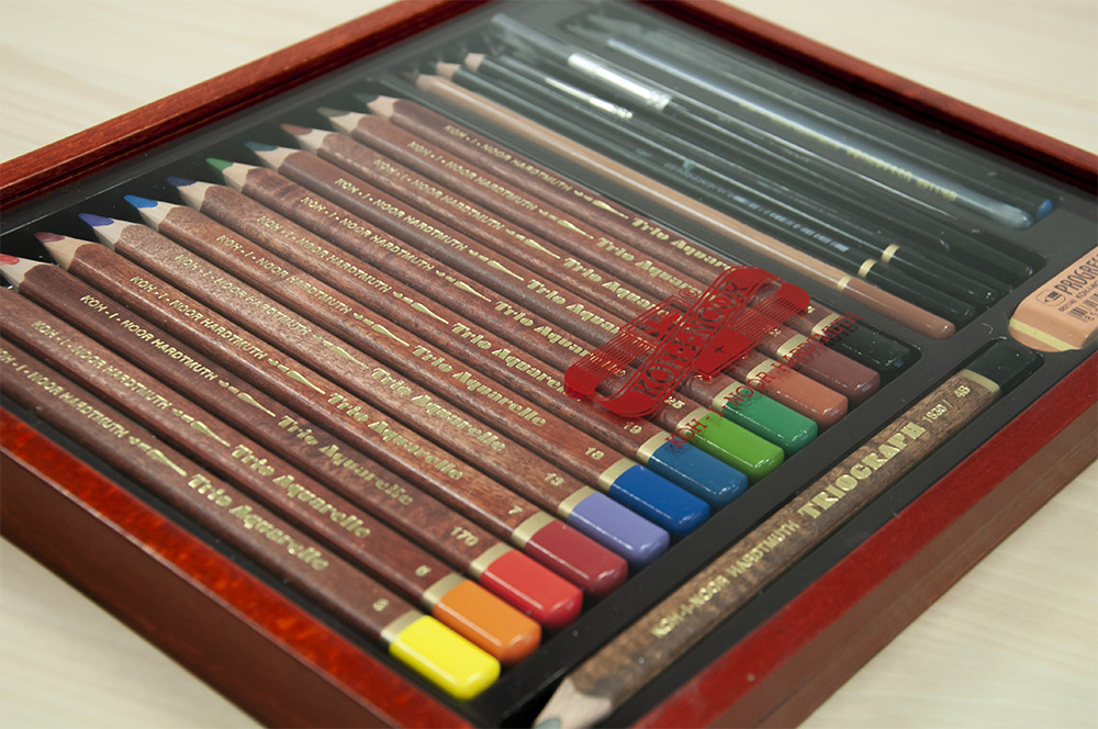 Posiadamy również w swojej ofercie ciekawy zestaw kredek Trio Aquarelle - to zestaw kredek akwarelowych trójbocznych w drewnianej kasetce. Eleganckie brązowe trzony stanowią ciekawą oprawę dla niezwykle miękkich grafitów. Do zestawu dołączone są ołówki, węgle i pędzelki oraz gumka do wymazywania, a całość przykryta jest przezroczystym wiekiem, dzięki czemu mamy pełny wgląd na zawartość zestawu.