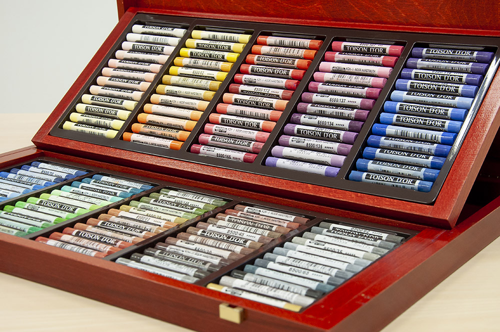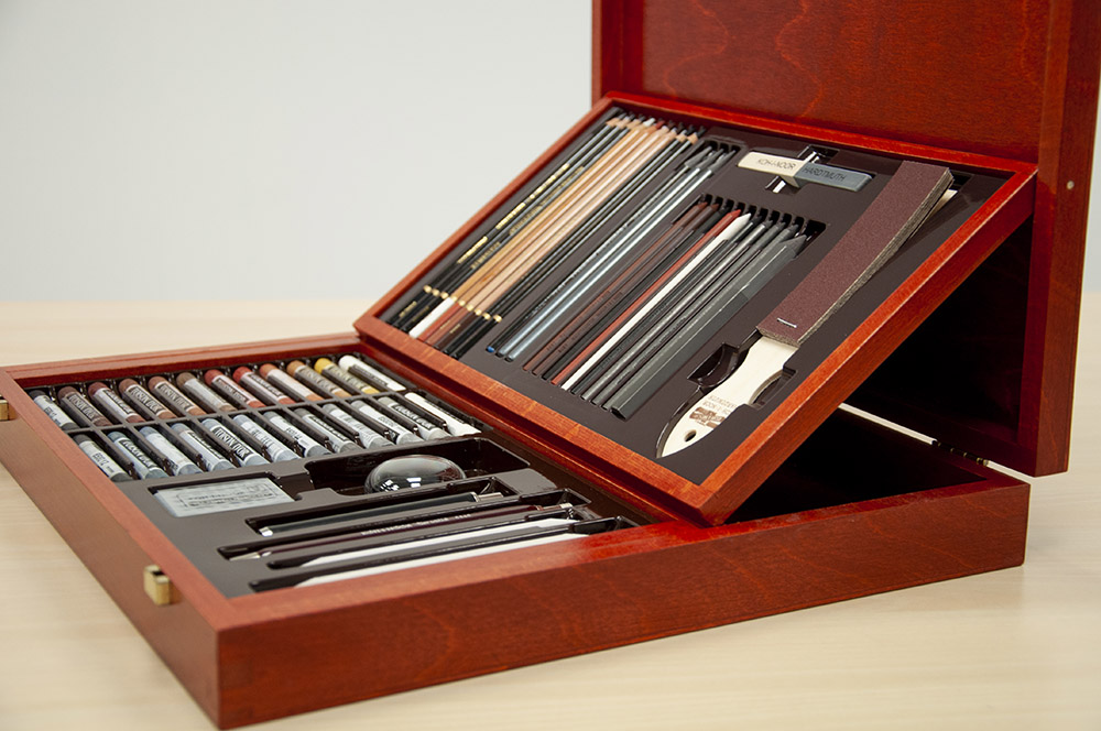 Niezwykle eleganckie i efektowne są zestawy pasteli oraz zestawy mediów rysunkowych w drewnianych, składanych kasetkach. Z jednej strony mamy pełną gamę pięknych kolorów pasteli suchych w sztyfcie, a z drugiej pełny komplet mediów do rysunku monochromatycznego. Co więcej kasetki są piętrowe, więc ilość przyborów jest na prawdę ogromna.